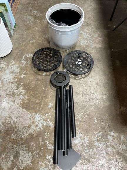 LOT 231 - (2) White Plant Pots w/ (2) Wheels Steel Plant Caddys and Wind Chimes