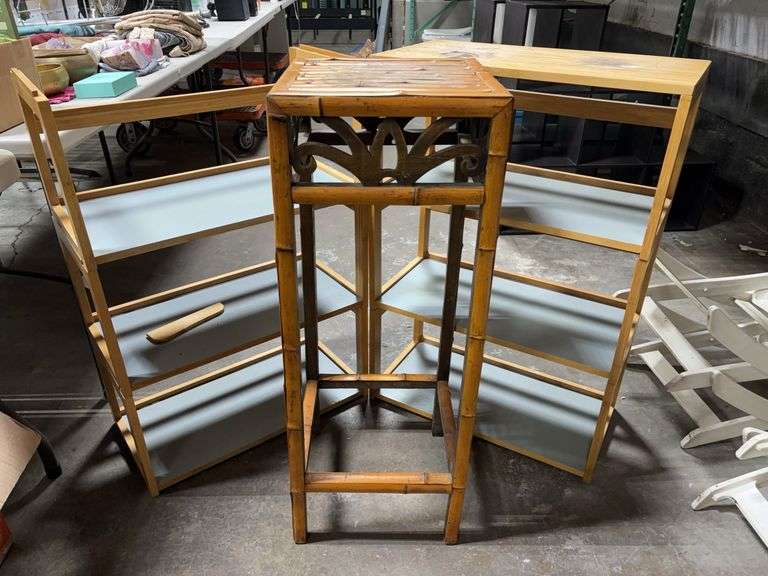 LOT 163 - (2) Modular 4-Tier Bamboo Shoe Racks & Bamboo Look Tall Side Table