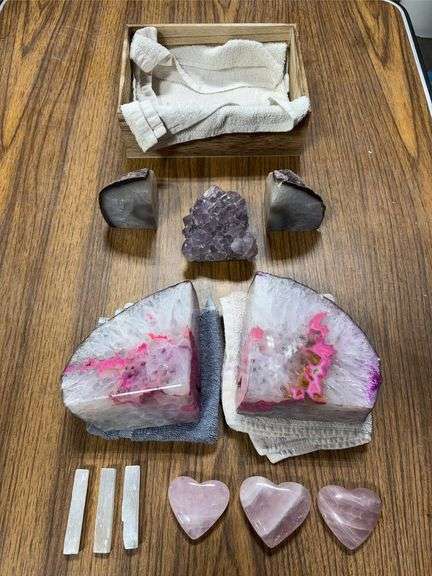 LOT 167 - Pink Dyed Agate Book Ends & Assorted Agates in Wood Box