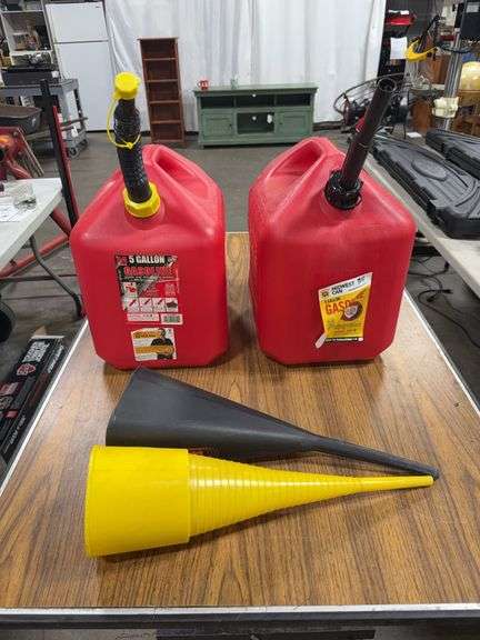 LOT 238 - (2) 5 Gallon Gas Canisters w/ Nozzles & (2) Funnels