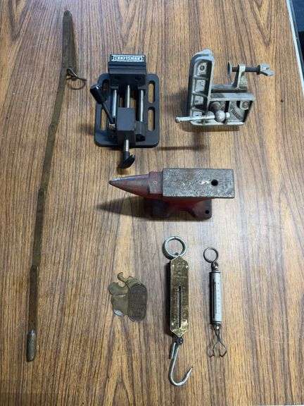 LOT 267 - Craftsman Vice/ Champion Bench Vice/ Mini Anvil/ Fishing Ruler & Weight Measuring Tools