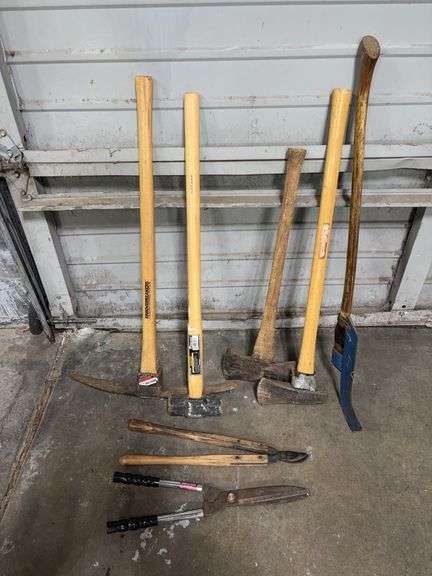 LOT 291 - Assorted Wood Handled Tools - Pickaxe/ Mallet/ Shears/ Axes